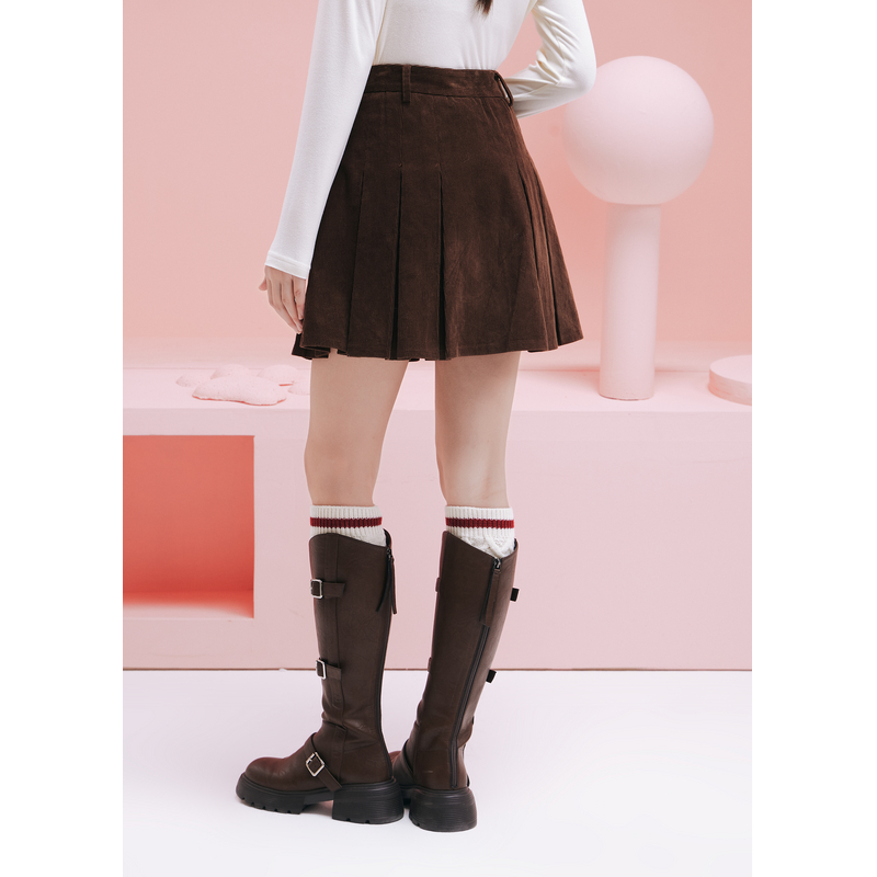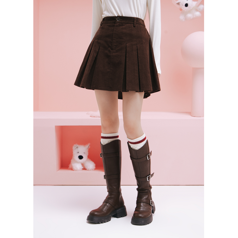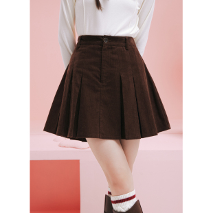 紫涵复古咖色百褶短裙女冬季 学院风高腰100%纯棉加厚a字裙子 新款