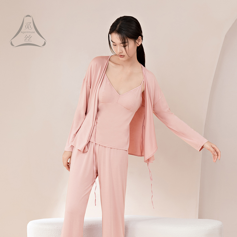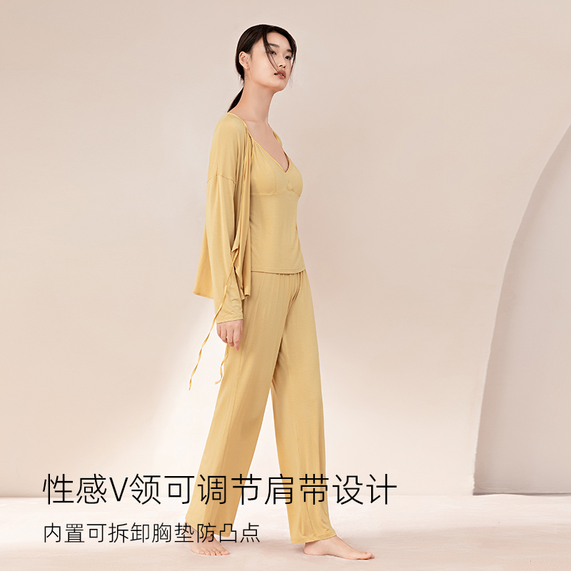 带胸垫吊带家居服三件套 天丝莫代尔睡衣女长袖 觅丝店播 裸感