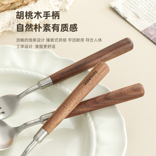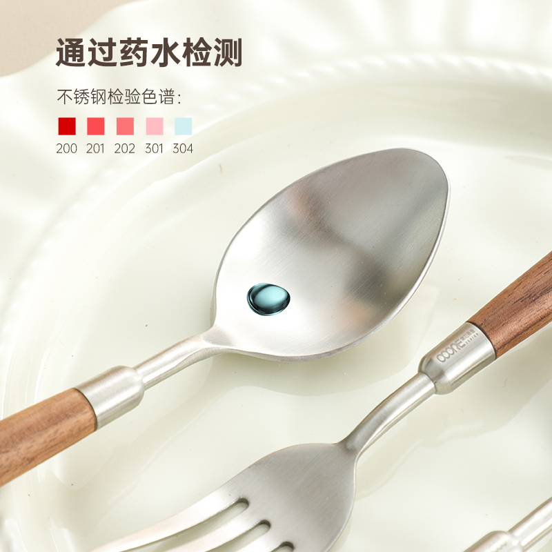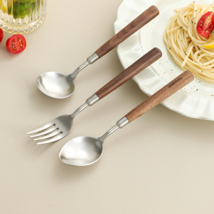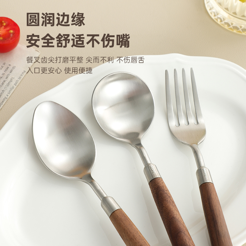304不锈钢胡桃木柄尖勺餐叉汤匙调羹家用吃饭勺子水果叉西餐餐具