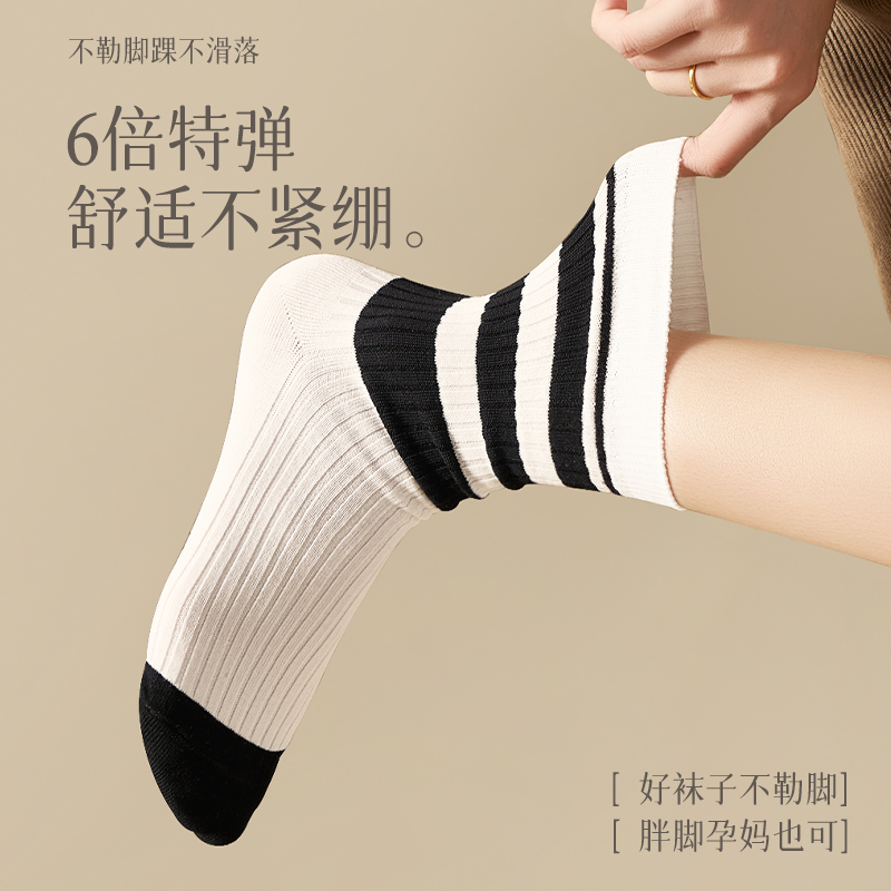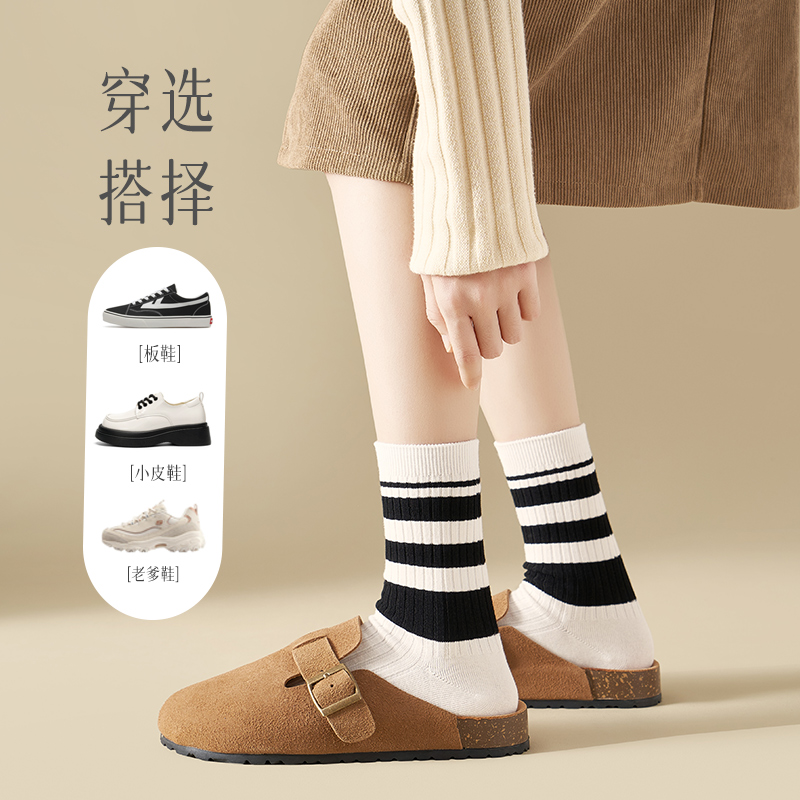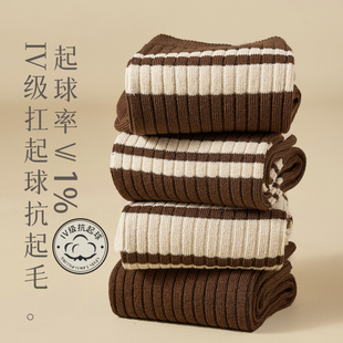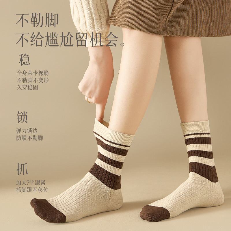 美拉德袜子女中筒袜春秋季 长筒棉袜 咖色条纹百搭堆堆袜搭配勃肯鞋