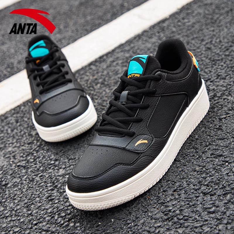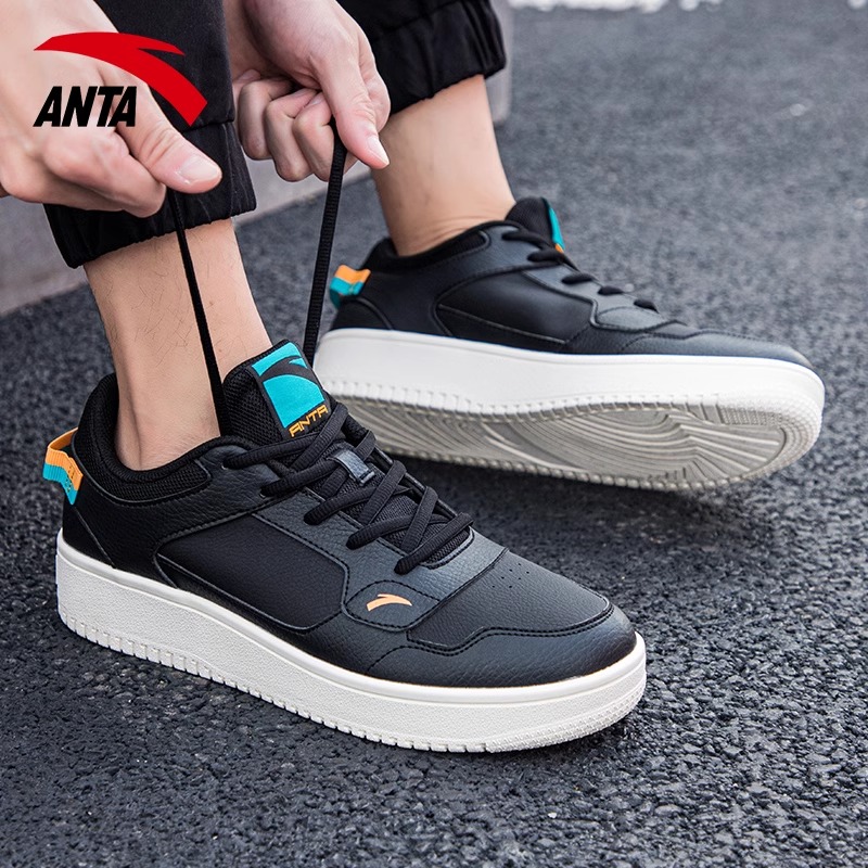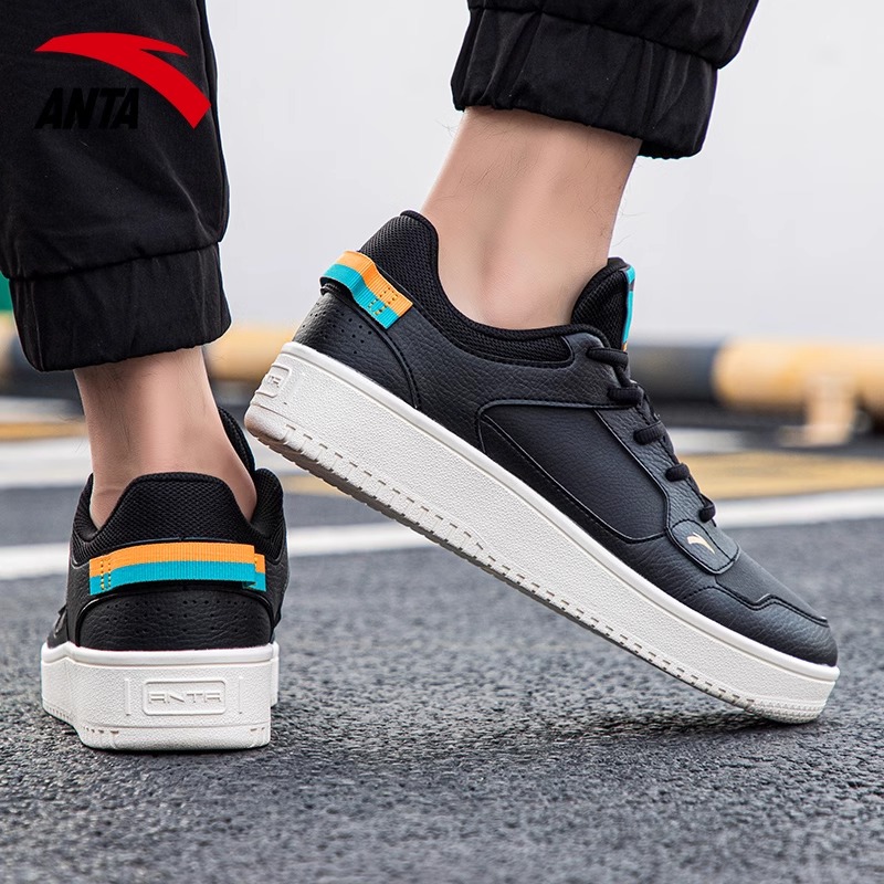 男皮面厚底学生运动潮鞋 安踏男鞋 滑板线休闲黑色板鞋 2025新款 秋季