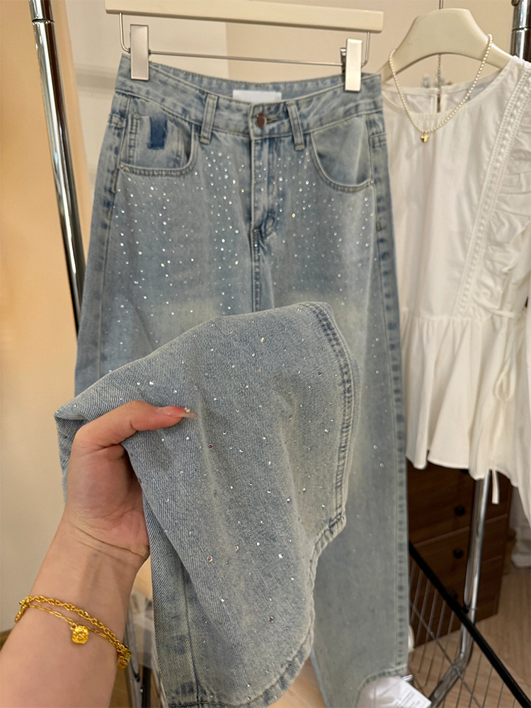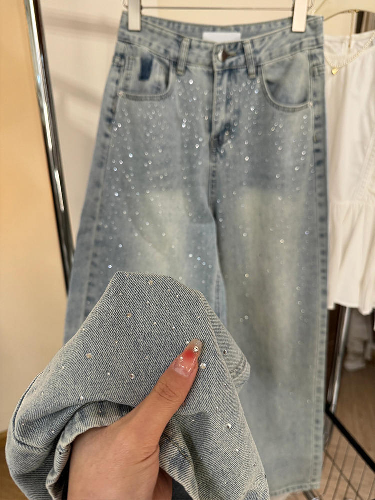 小个子显瘦阔腿直筒裤 复古重工烫钻水洗高腰牛仔裤 女2025早春新款