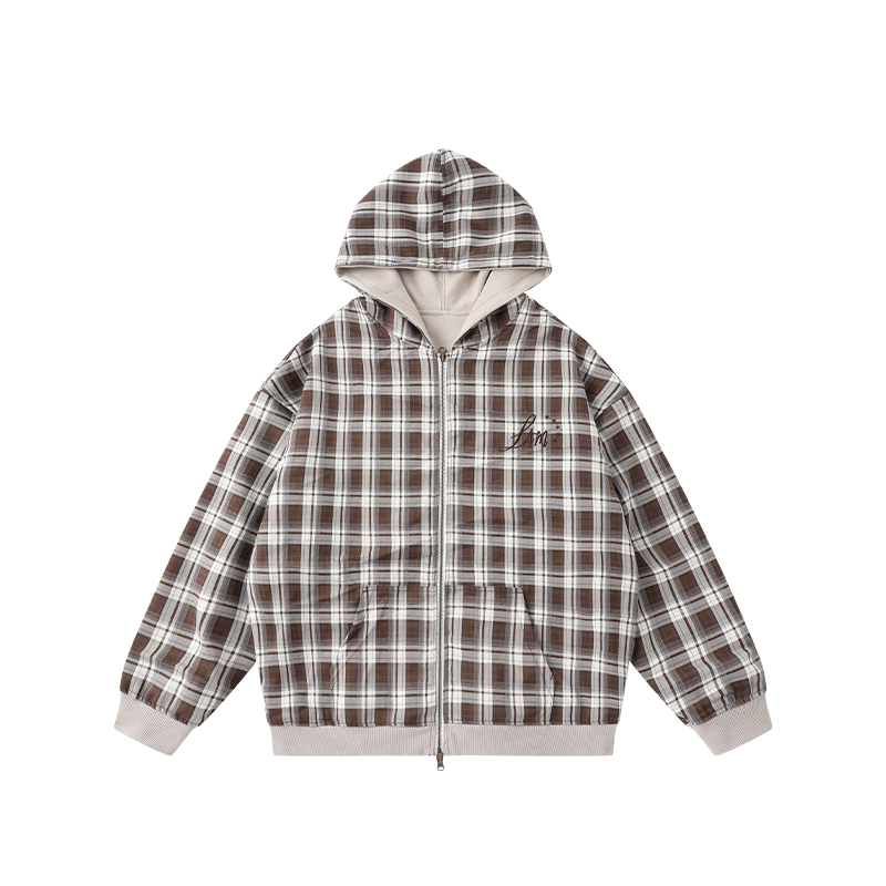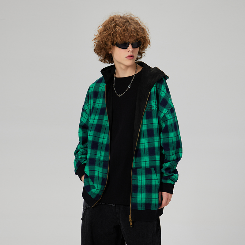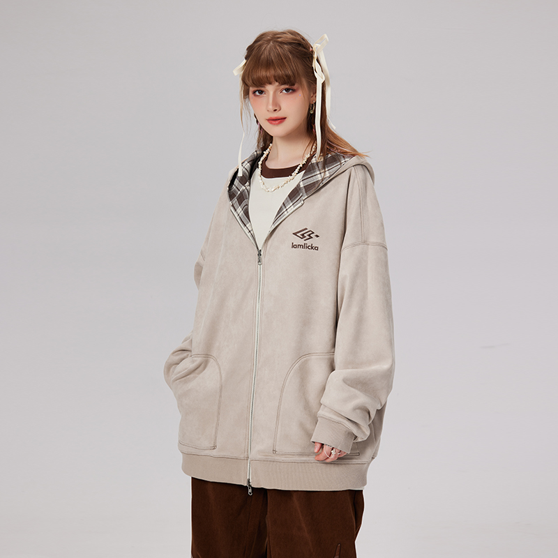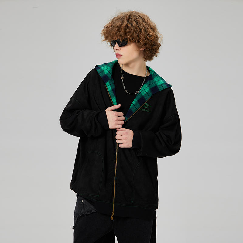 宽松 拉链外套帽衫 LAMLICKA麂皮绒格子双面穿连帽卫衣男秋季 情侣装