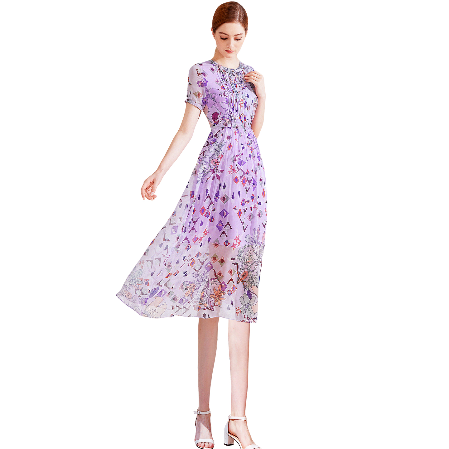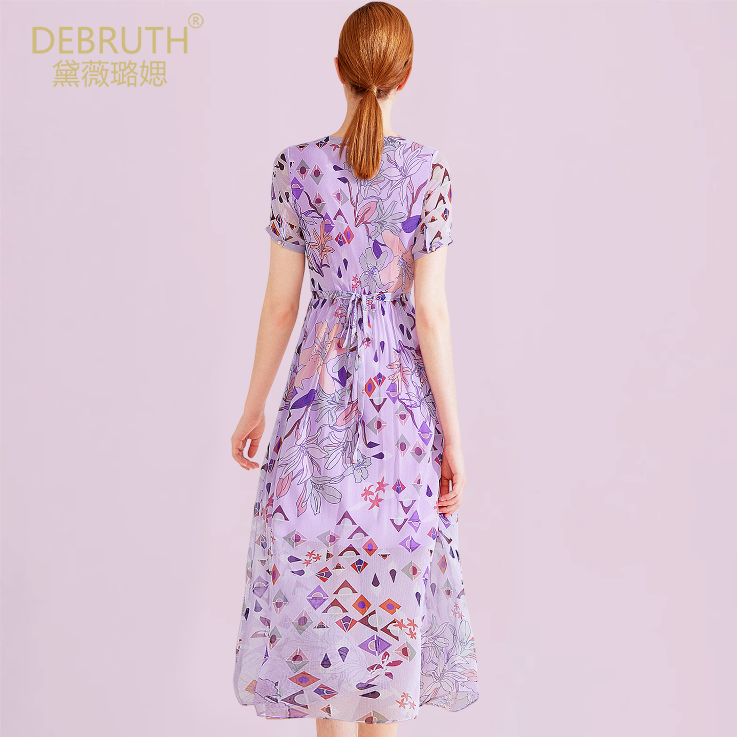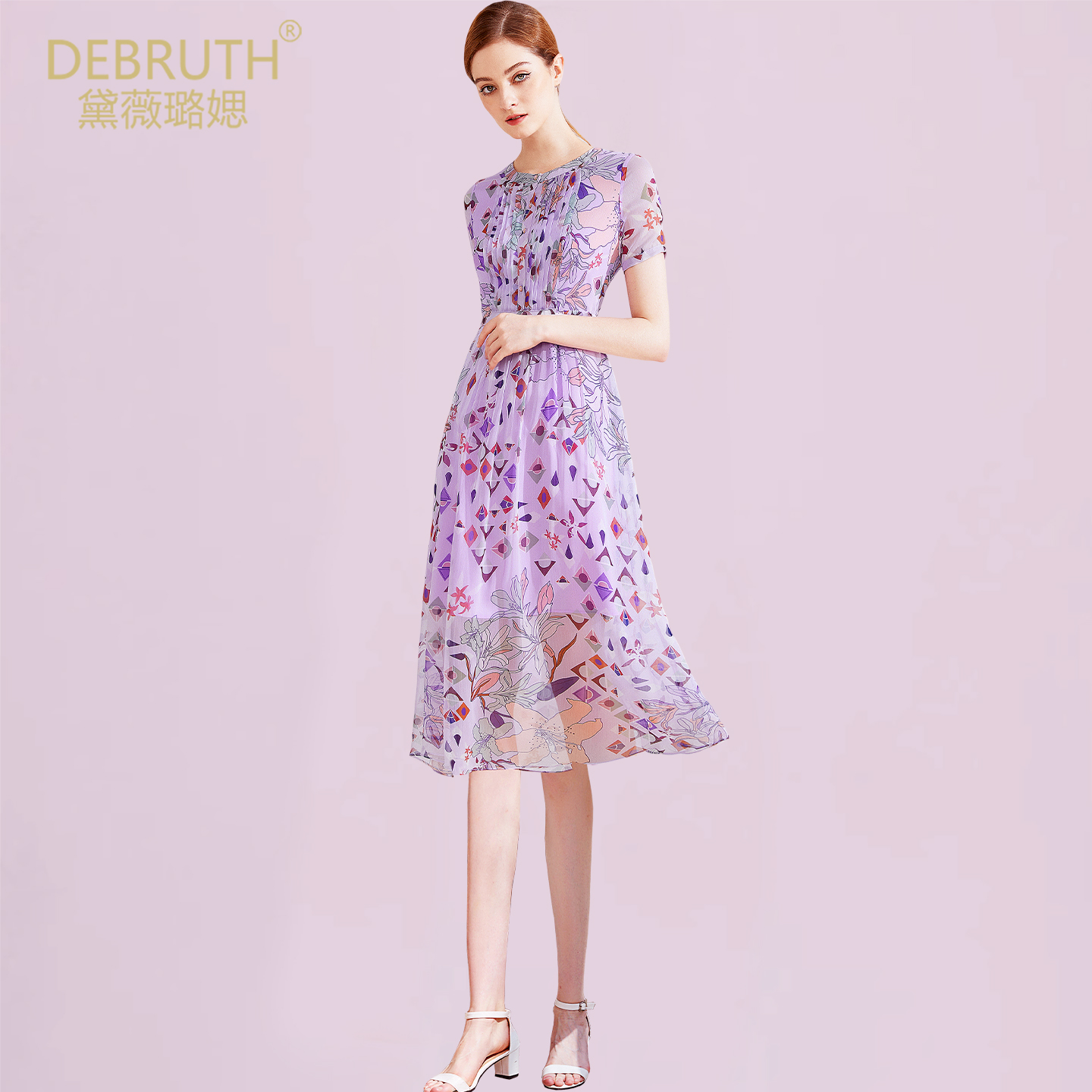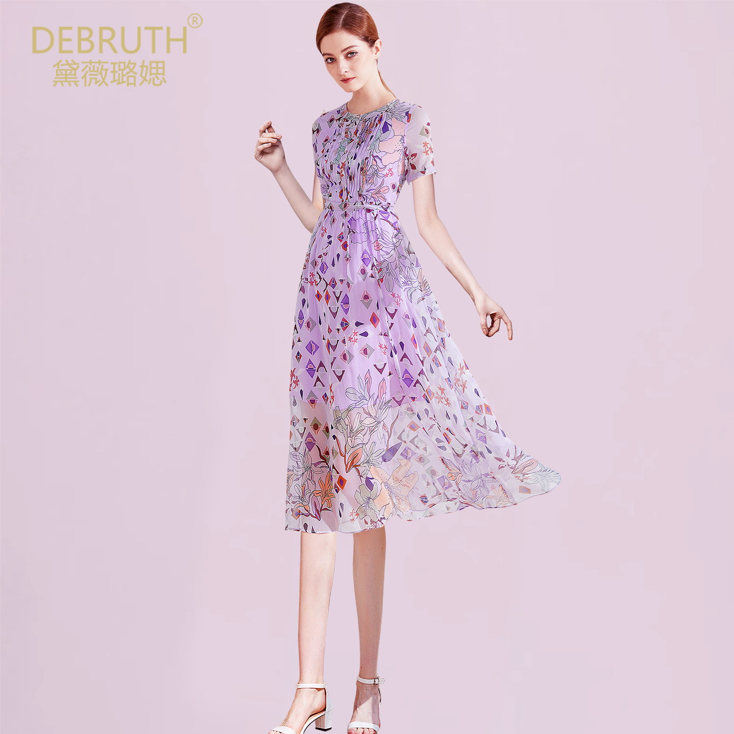 气质收腰A裙紫 法式 黛薇璐媤印花雪纺短袖 公主连衣裙女2025夏新款
