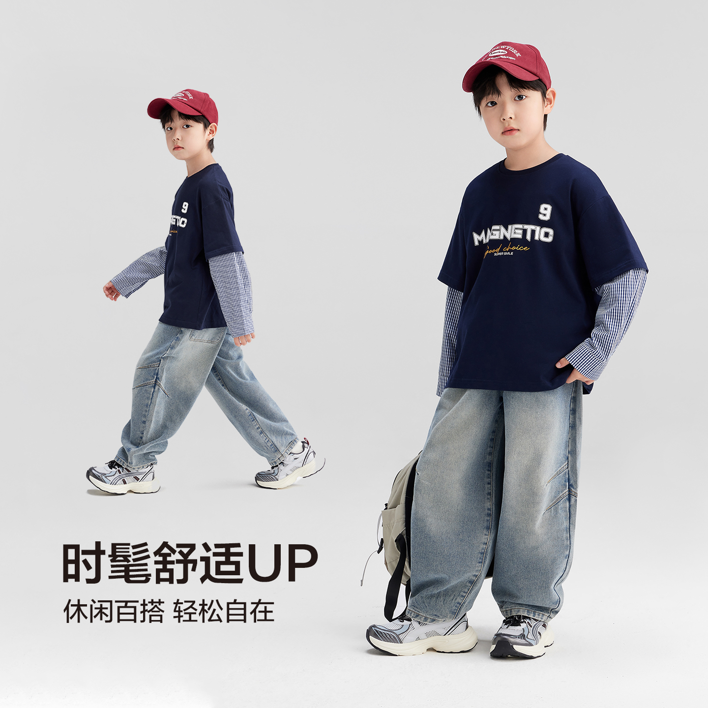 春秋2025新款 纯棉假两件儿童秋装 男孩大童潮 男童T恤长袖 左西童装