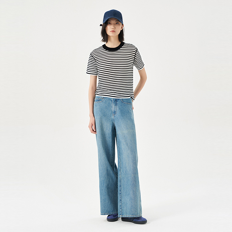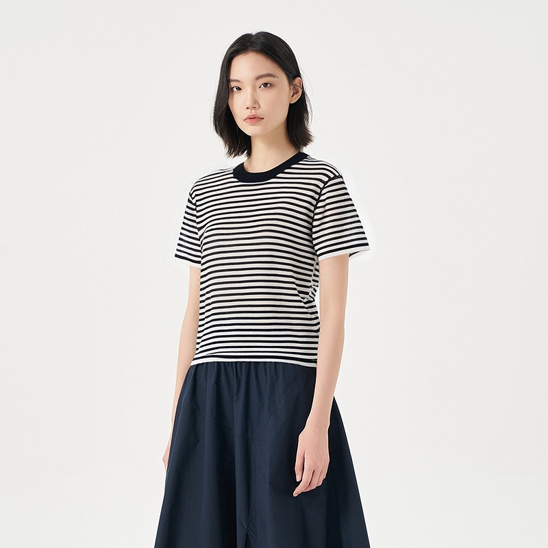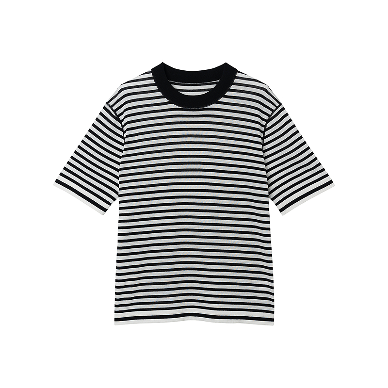 针织衫 OTT2025秋新品 百搭短袖 女时尚 简约条纹撞色圆领毛织套头衫