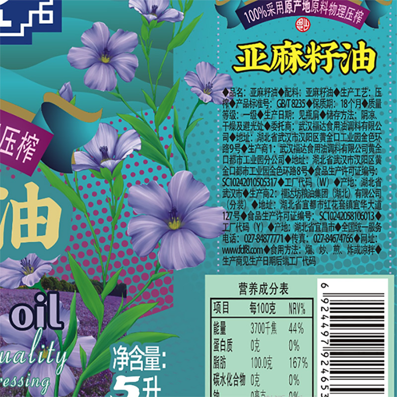 福达坊纯亚麻籽油5L食用油营养健康家用不添加其他油脂