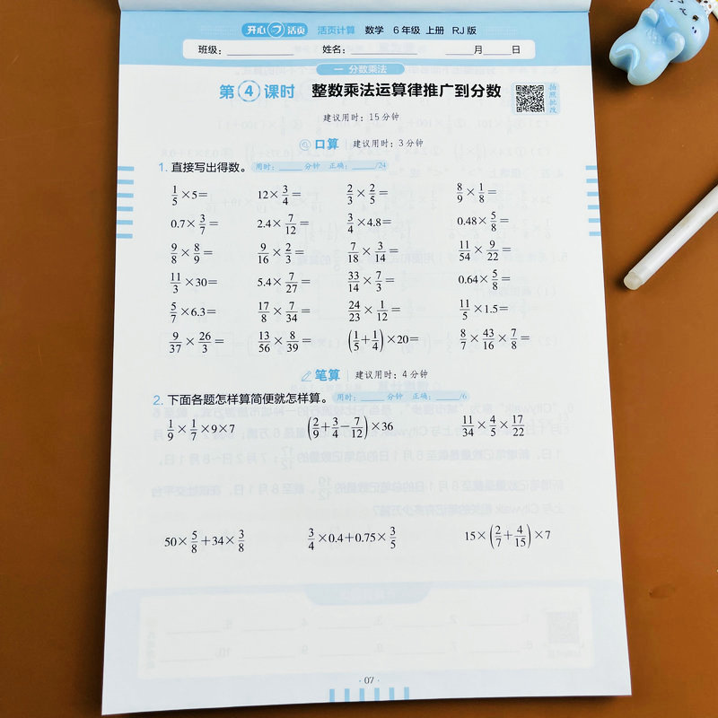 计算6年级上学期分数乘法分数除法比圆 教材同步口算竖式 周长面积百分数扇形统计图 小学数学活页计算六年级上册人教版 2025新版