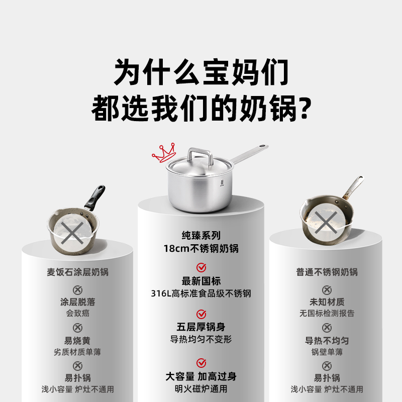 莱德斯316L不锈钢食品级奶锅不粘锅无涂层家用宝宝辅食锅一人食