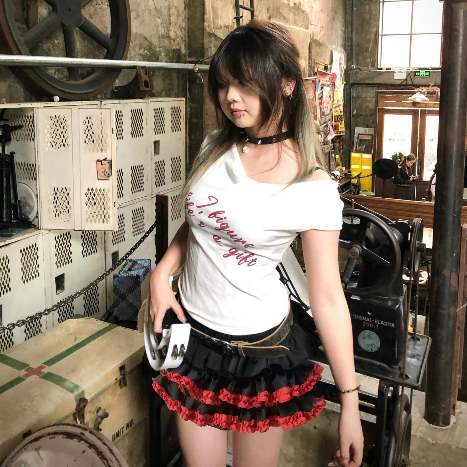 日系拼接色蓬蓬裙女夏季 亚比风松紧腰百搭木耳花边半身裙子 新款