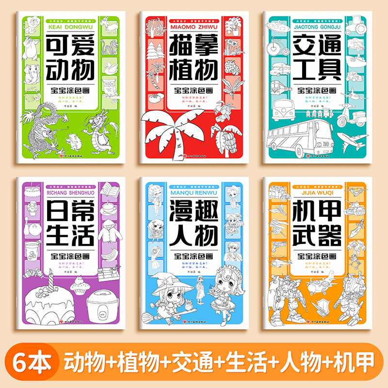 找不同专注力训练宝宝益智临摹画册套装 6岁宝宝绘本儿童线描卡通动物植物交通工具日常上色 涂色绘本 简笔画全6册宝宝涂色画本