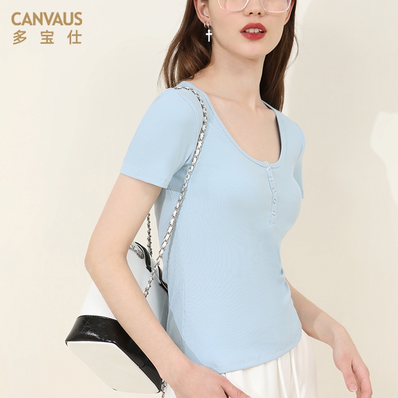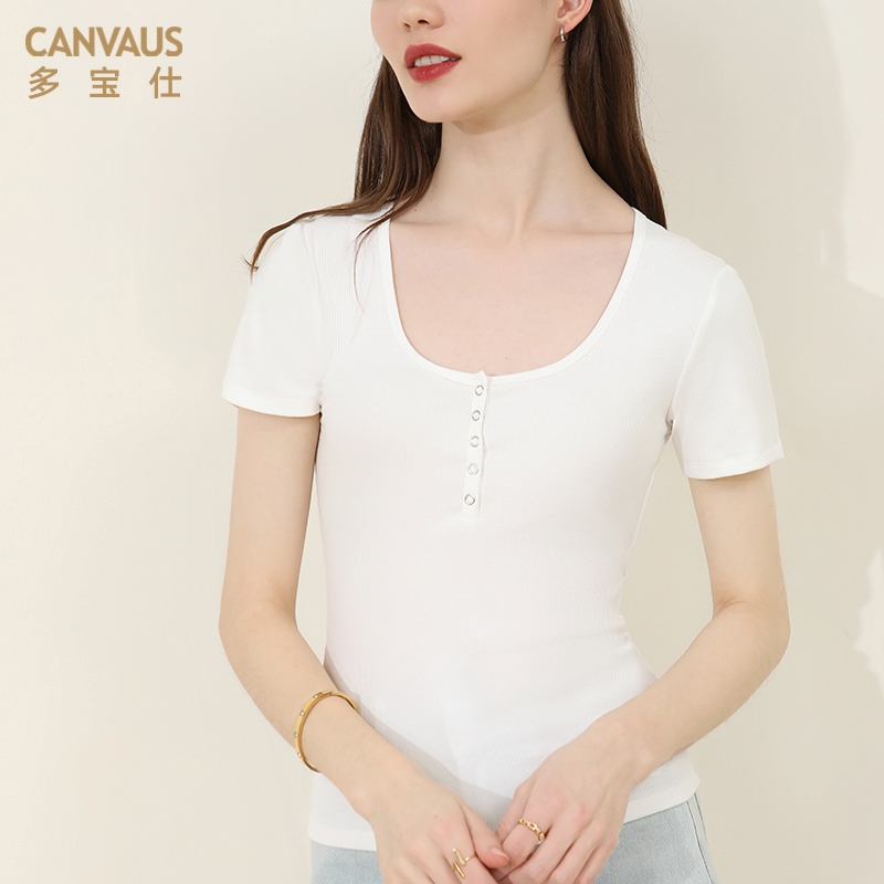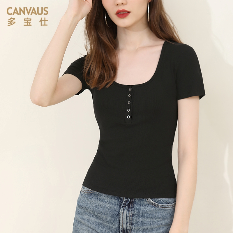 性感体恤打底衫 半开领修身 大圆领t恤女亨利领上衣短袖 多宝仕夏季