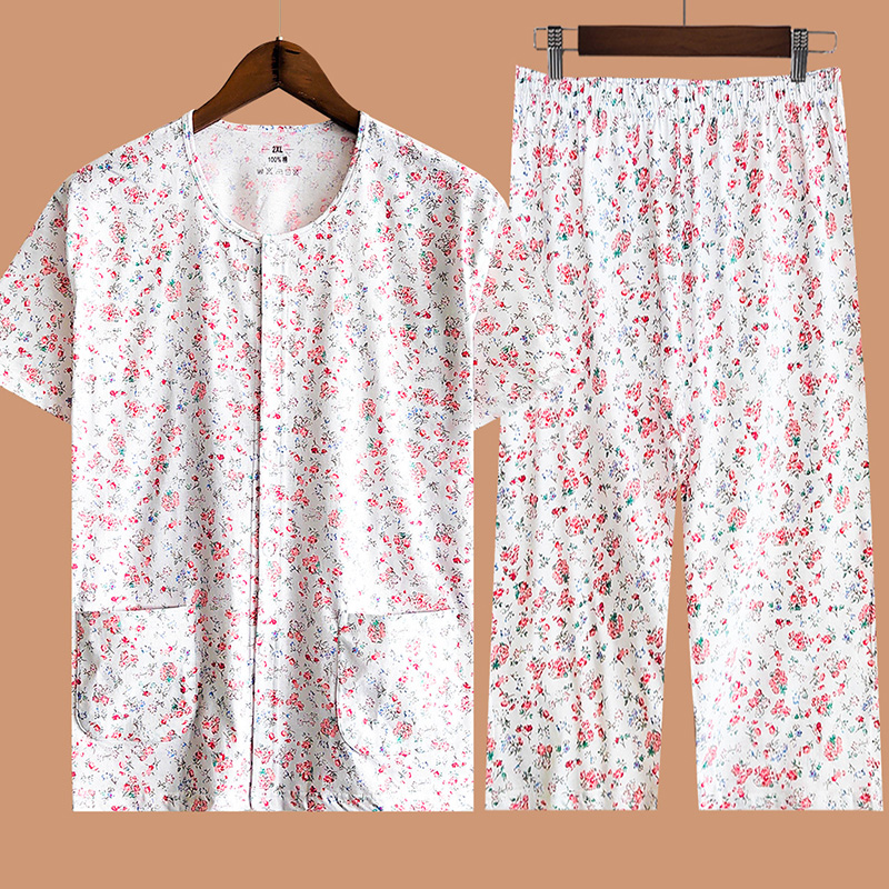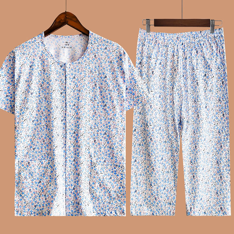 套装 七分裤 女士妈妈夏季 薄款 睡衣家居服女 中老年人开衫 妈妈装 短袖