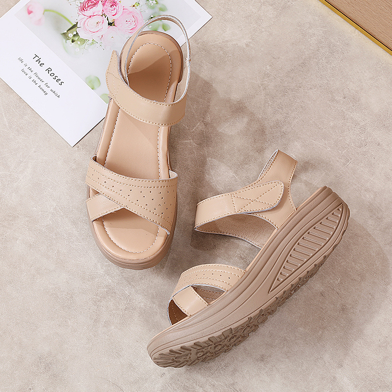 真皮百搭一字带厚底坡跟凉鞋 简约仙女风松糕凉鞋 韩版 2025春夏新款