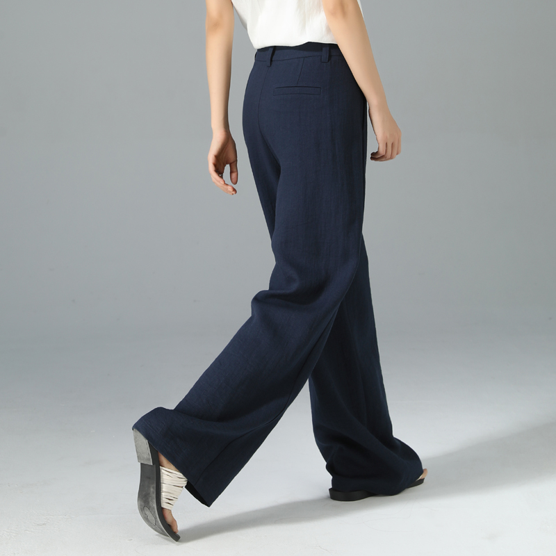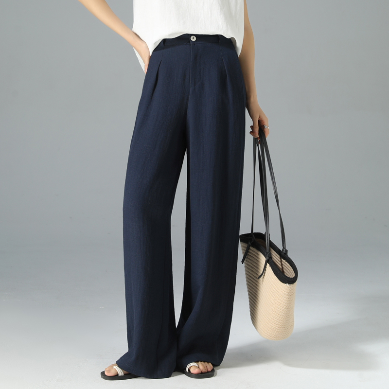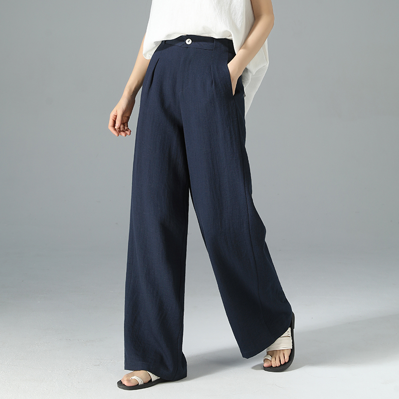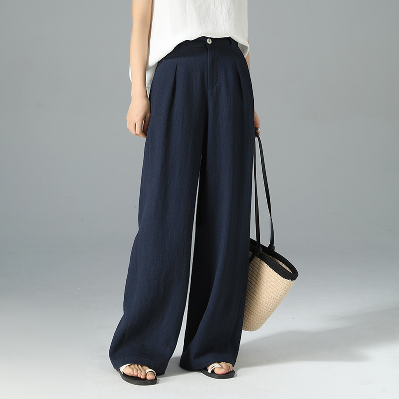 高腰垂感休闲直筒拖地裤 藏青色天丝亚麻阔腿裤 2025新款 薄款 女夏季