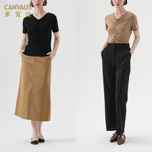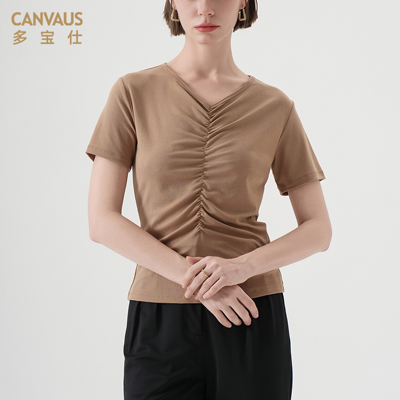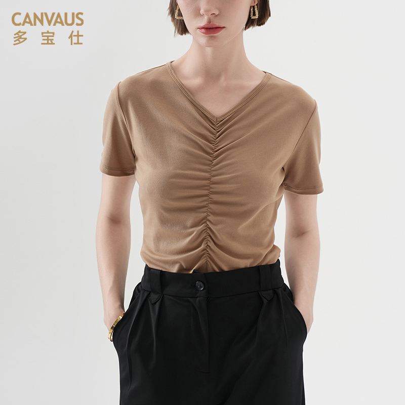 新款 上衣2025夏季 收腰减龄T恤 V领简约百搭洋气小衫 多宝仕黑色短袖