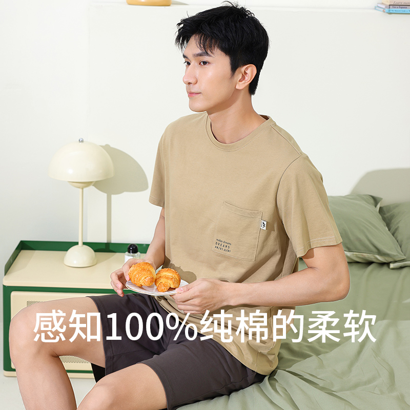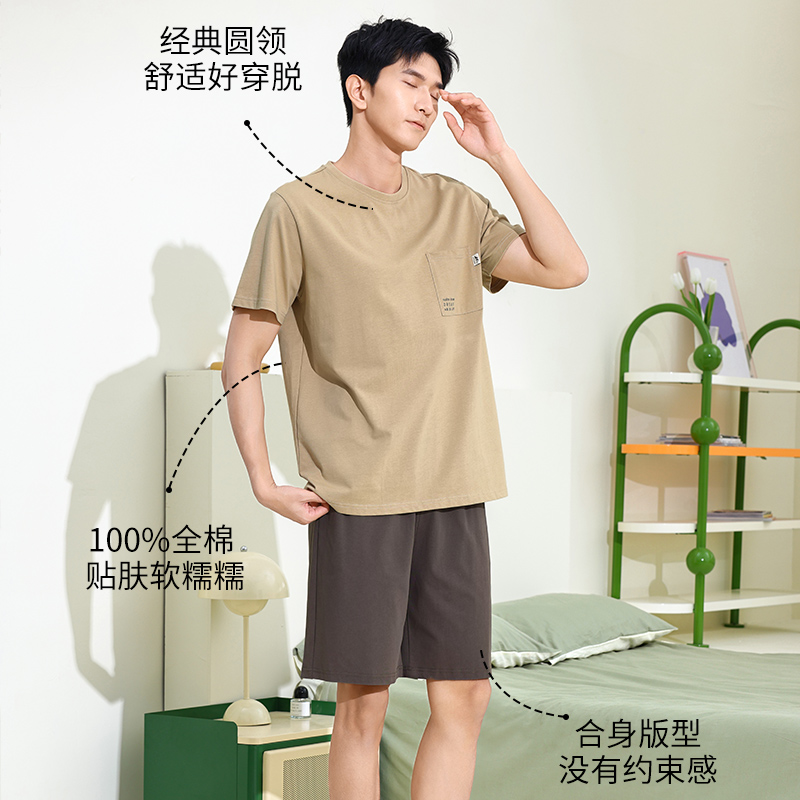 简约舒适全棉外穿家居服套装 秋鹿睡衣男纯棉夏款 短裤 圆领短袖 新款