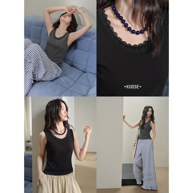 打底短上衣 黑色蕾丝花边修身 阔色白色针织吊带背心女2025夏季 新款