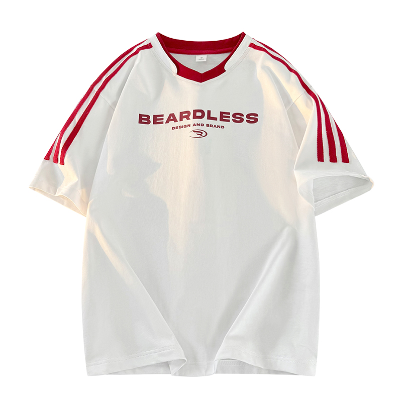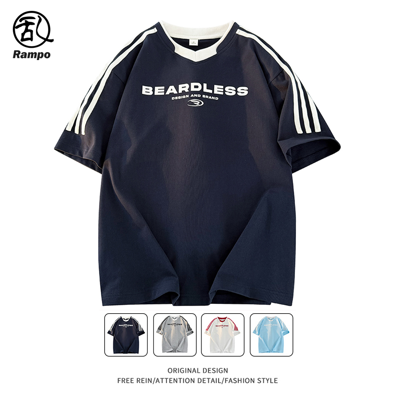 青少年插肩袖 t恤男女夏季 字母上衣服体恤 潮牌三条杠条纹短袖 美式