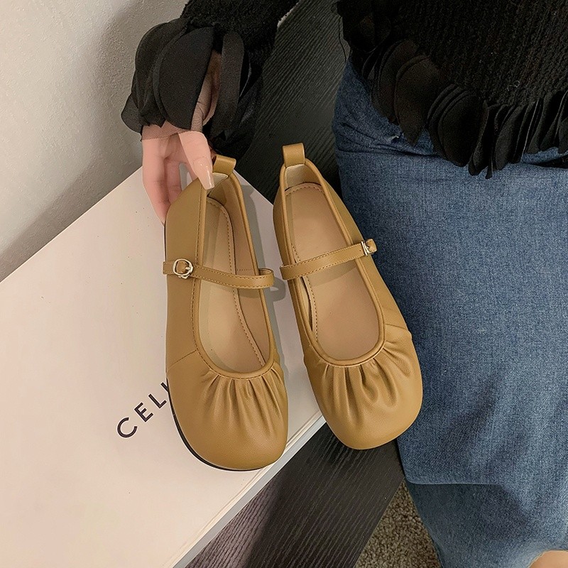 复古奶奶鞋 浅口单鞋 褶皱平底一字带玛丽珍女鞋 韩版 子 女2025年新款
