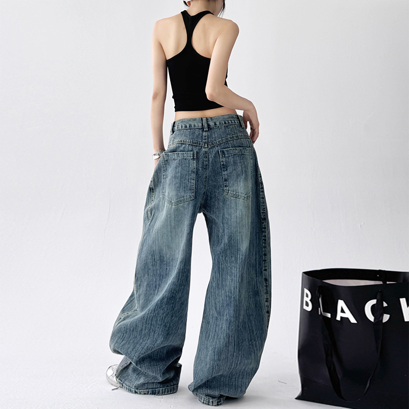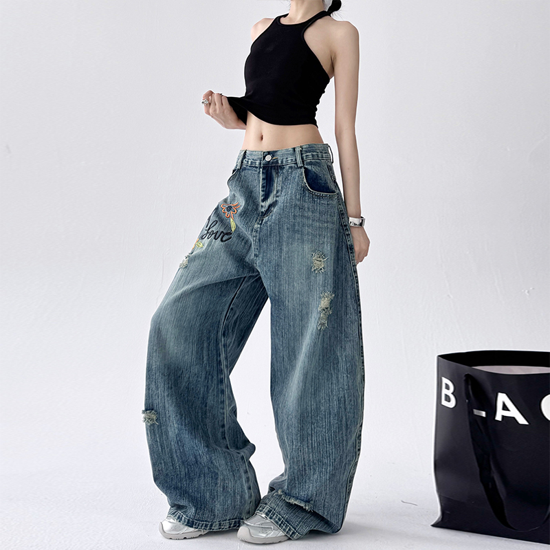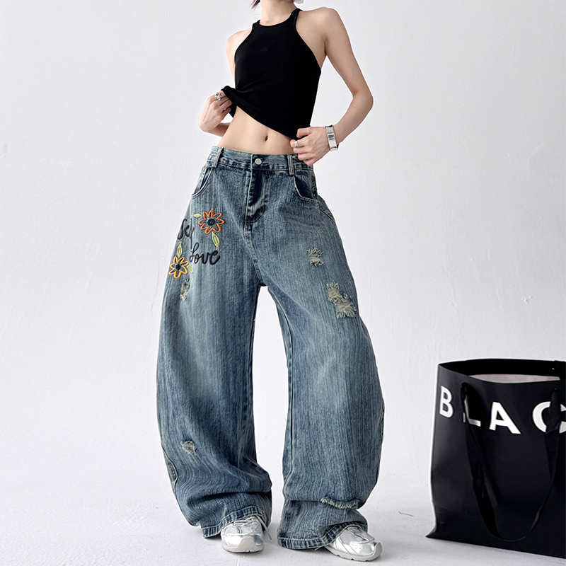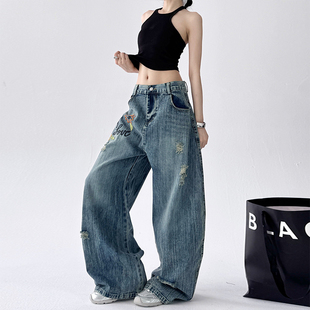 宽松直筒破洞拖地长裤 新款 子 女2025夏季 花卉刺绣竹节纹弯刀牛仔裤