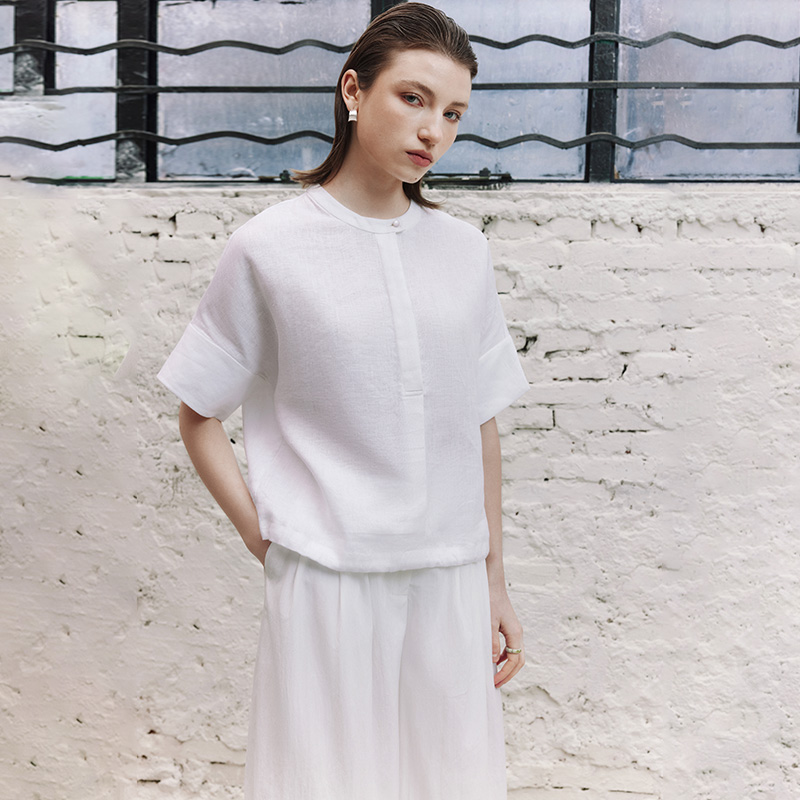 舒适亚麻 宽松简约纯色老钱风衬衫 夏新品 口短衬衫 亚麻宽袖 初时