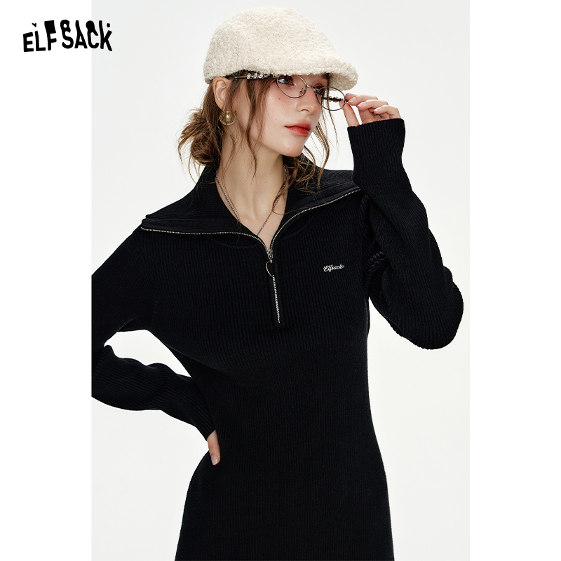 女装 大码 美丽客栈2025秋冬新款 高级感黑色针织连衣裙子 绵羊毛