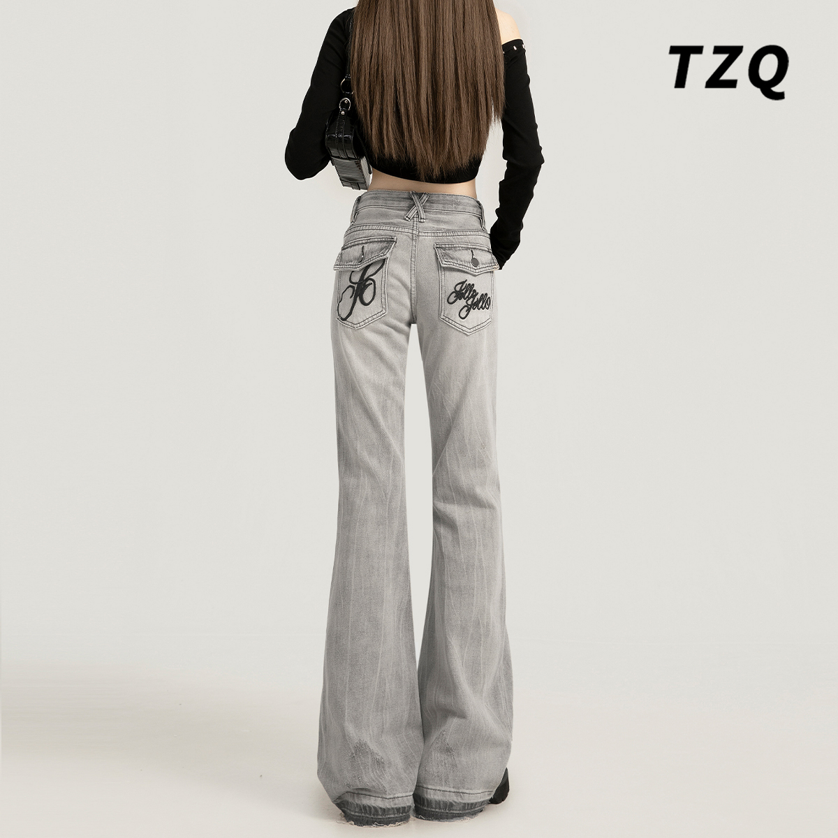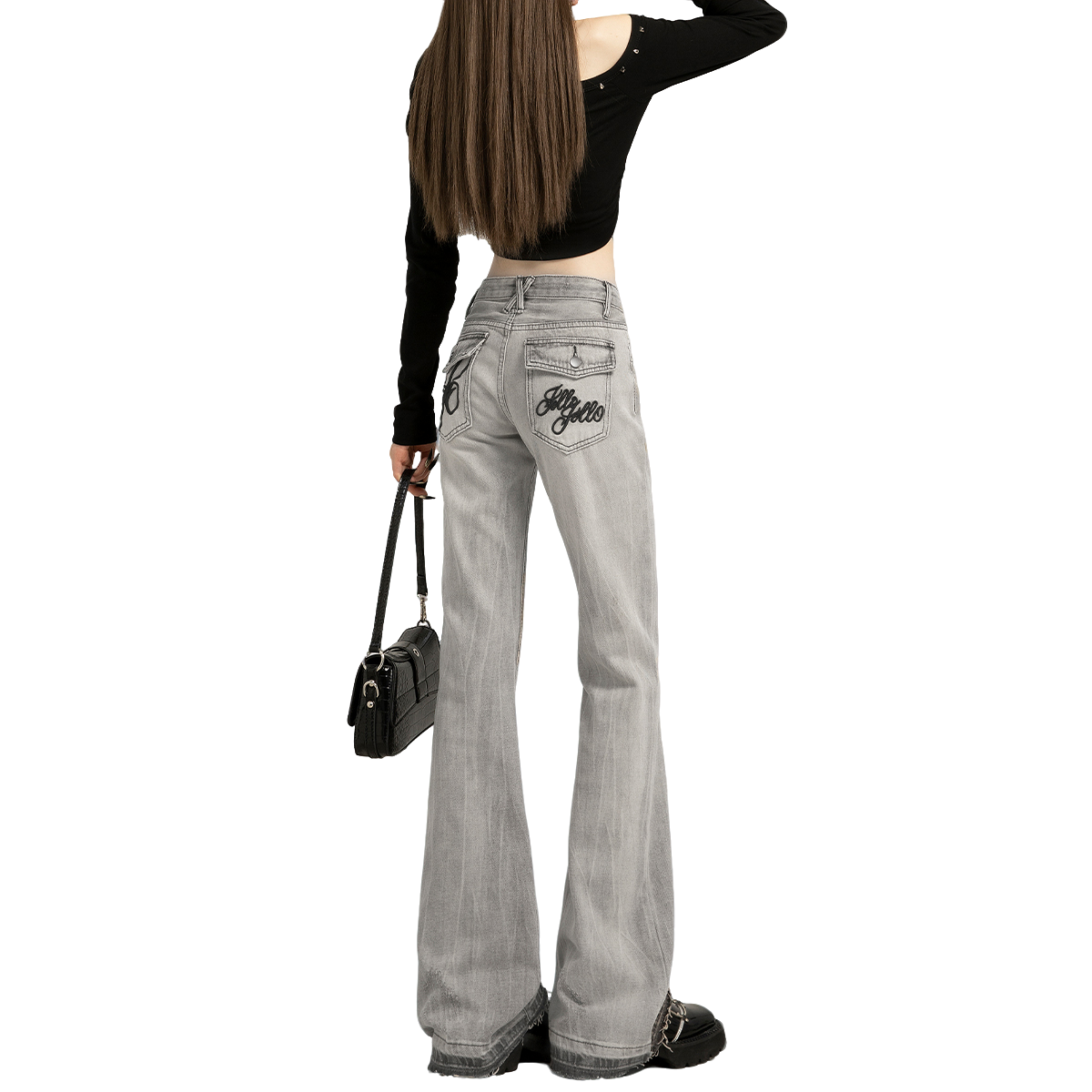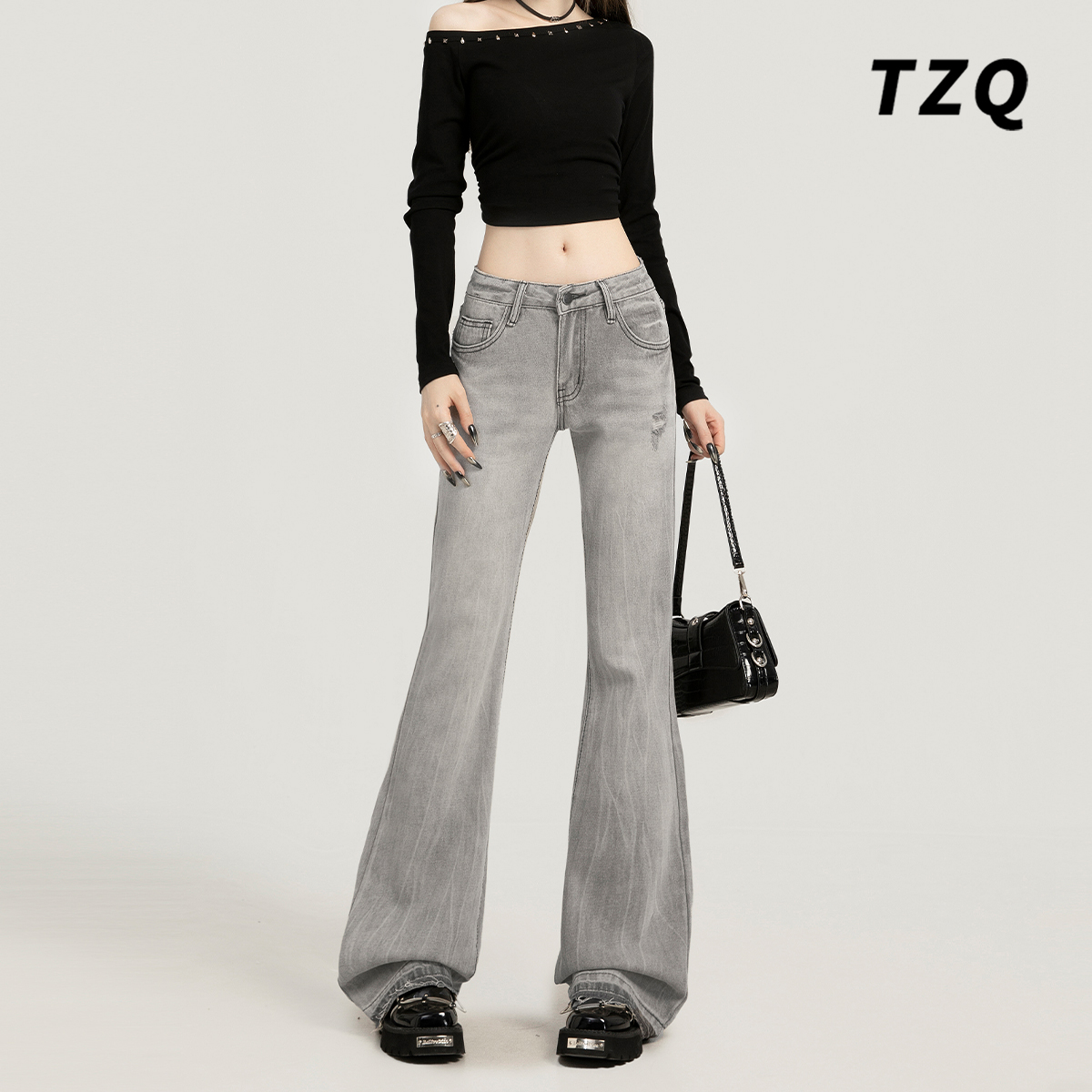 高腰显瘦弹力马蹄阔腿喇叭裤 2025新款 子 女春秋季 黑灰色微喇牛仔裤