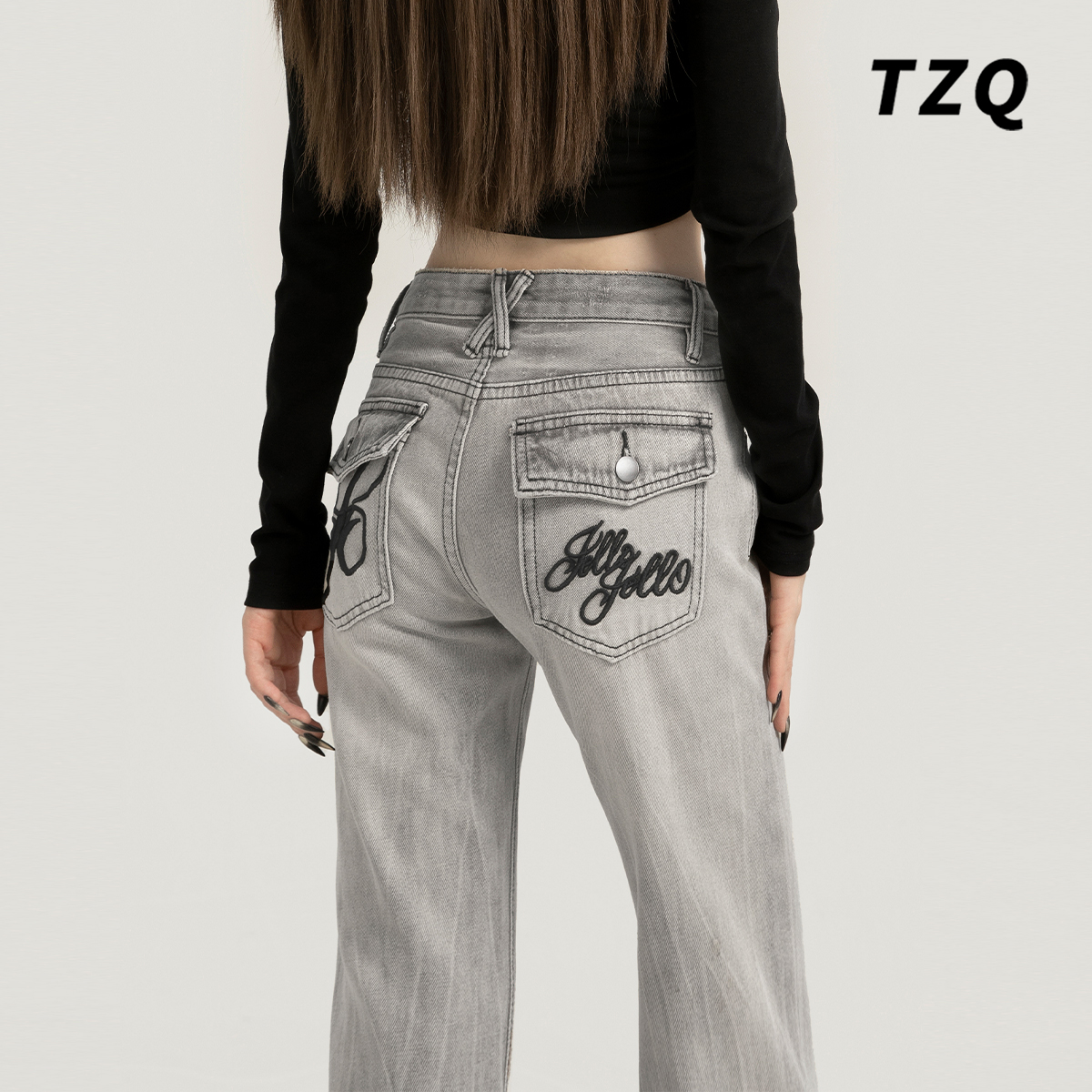 女2025秋解构设计高级感阔腿裤 牛仔裤 子 口袋复古宽松弯刀裤 妖精