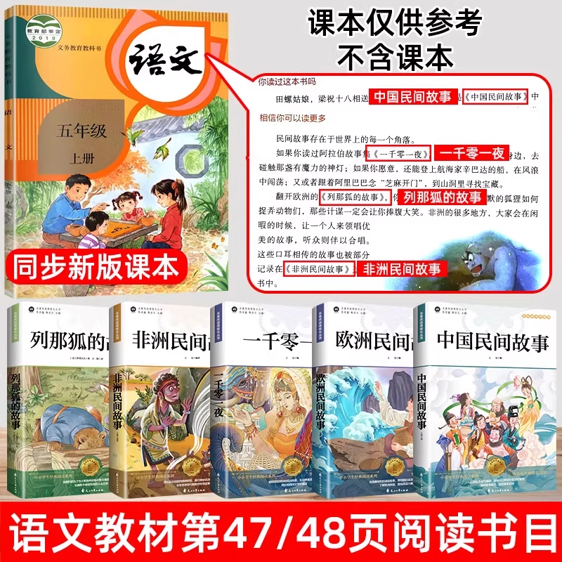 故事小学生阅读推荐 中国民间故事五年级上册下册四大名著快乐读书吧必读 完整5上列那狐 欧洲非洲民间正版 课外书全套5册