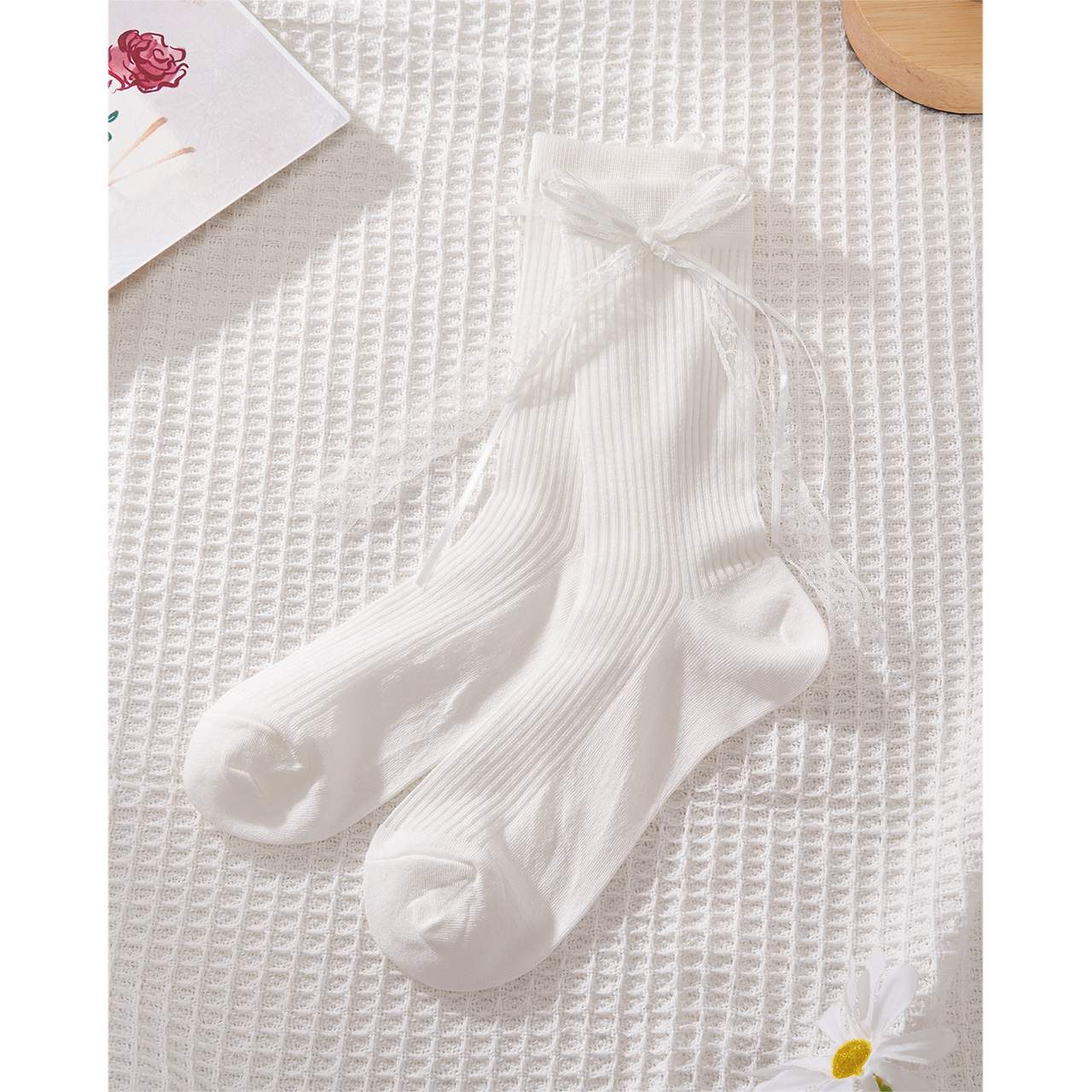 薄款 无骨袜子女士春秋款 中筒袜木耳花边月子堆堆袜白色长筒袜夏季