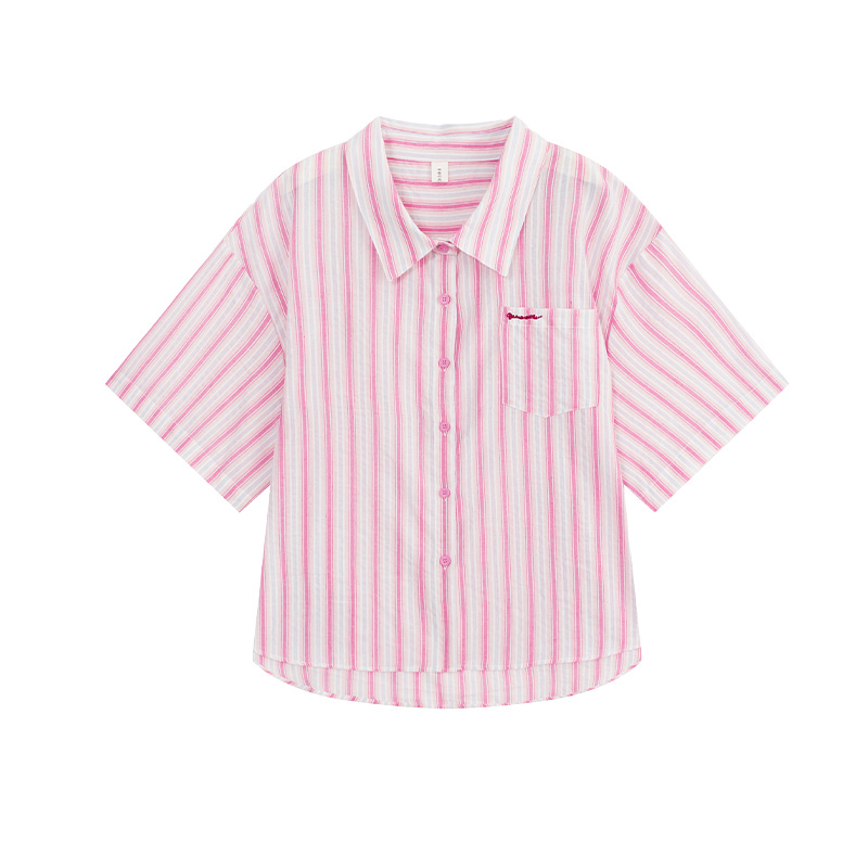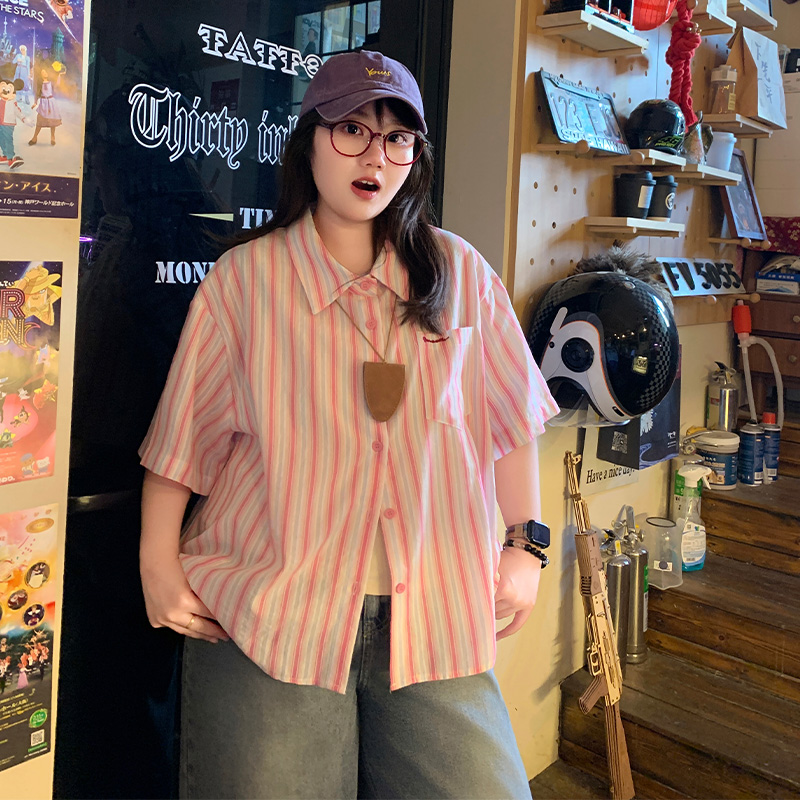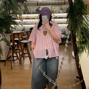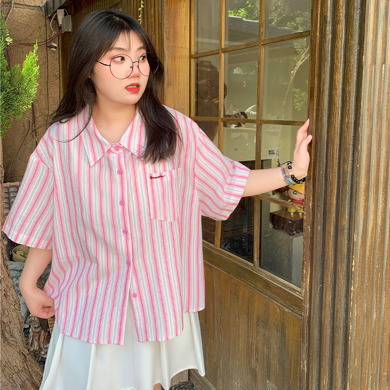 女装 甜美大码 微胖mm显瘦上衣慵懒度假风 衬衫 YUZI鱼子条纹短袖