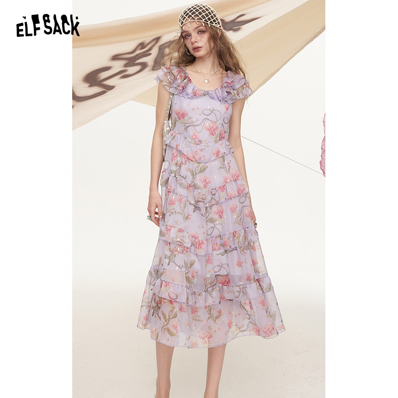 新款 荷叶边碎花连衣裙女2025夏季 气质收腰度假裙子 口袋法式 妖精