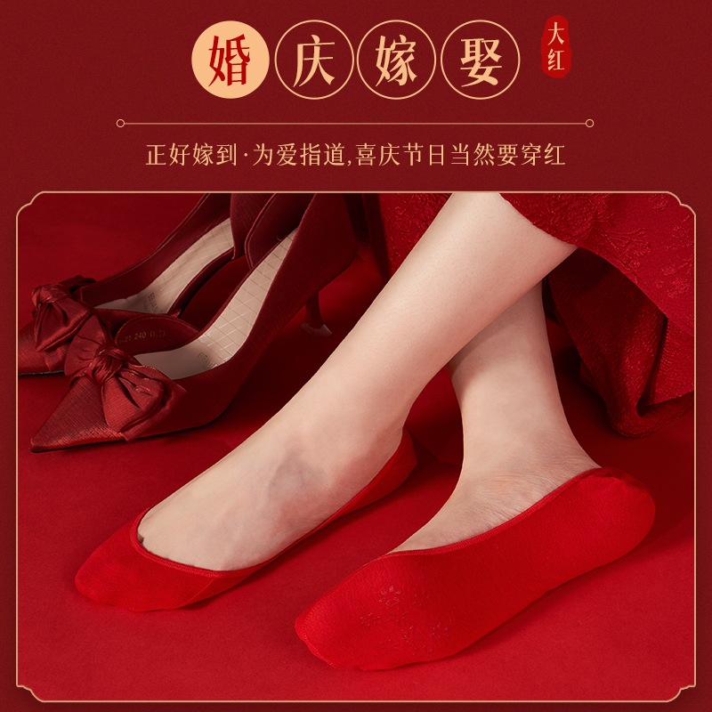 高档婚庆双喜情侣袜结婚高跟鞋 袜子浅口隐形吊带船袜本命年红色袜