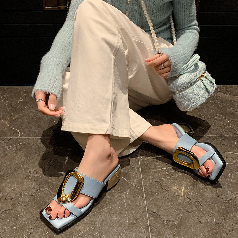 露趾方头时尚 朋克少女 2025新款 女款 粗跟一字拖 头层牛皮外穿凉鞋