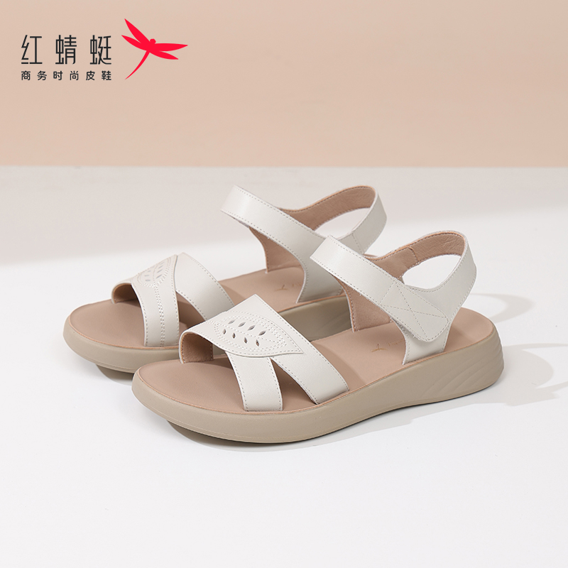 女款 女士魔术贴软底妈妈凉鞋 真皮女鞋 外穿2025新款 夏季 红蜻蜓凉鞋