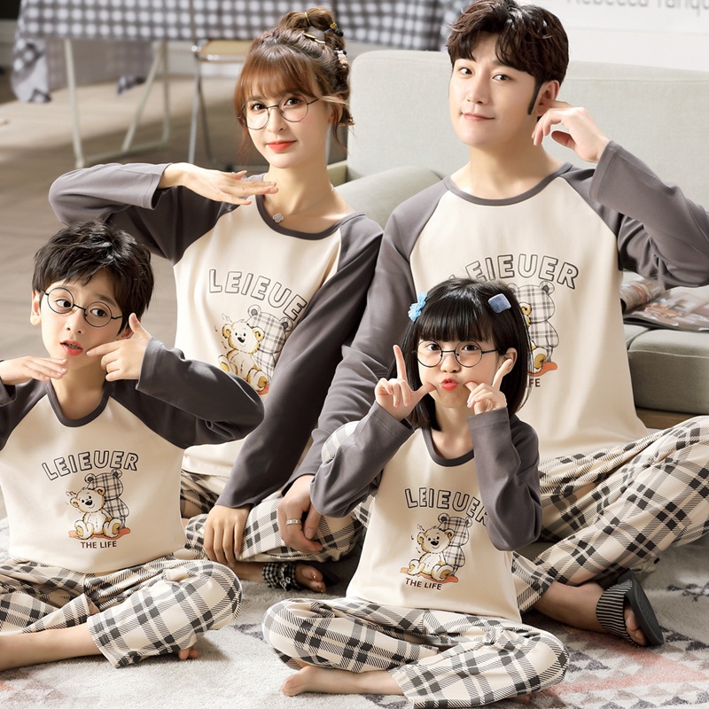 纯棉春秋季 长袖 男女儿童薄家居服 休闲亲子睡衣一家三口母女装 韩版