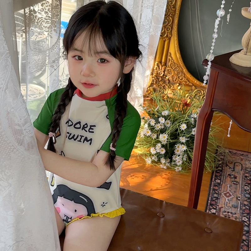 海边度假 防晒泳装 2025新款 儿童女童游泳衣可爱卡通涂鸦连体长袖