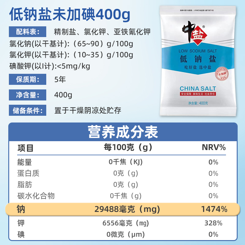 中盐低钠盐未加碘400g 7袋深井矿盐无碘甲状腺食用盐家用细盐补钾