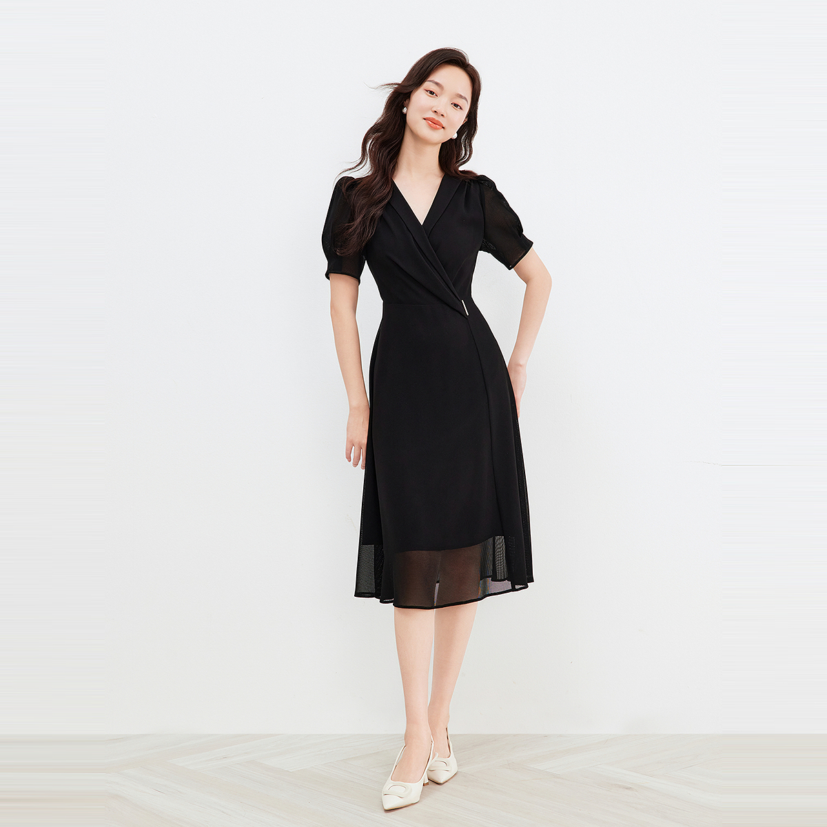 罗衣经典 连衣裙女简约高质感内搭中长裙子11060 黑色收腰大摆无袖