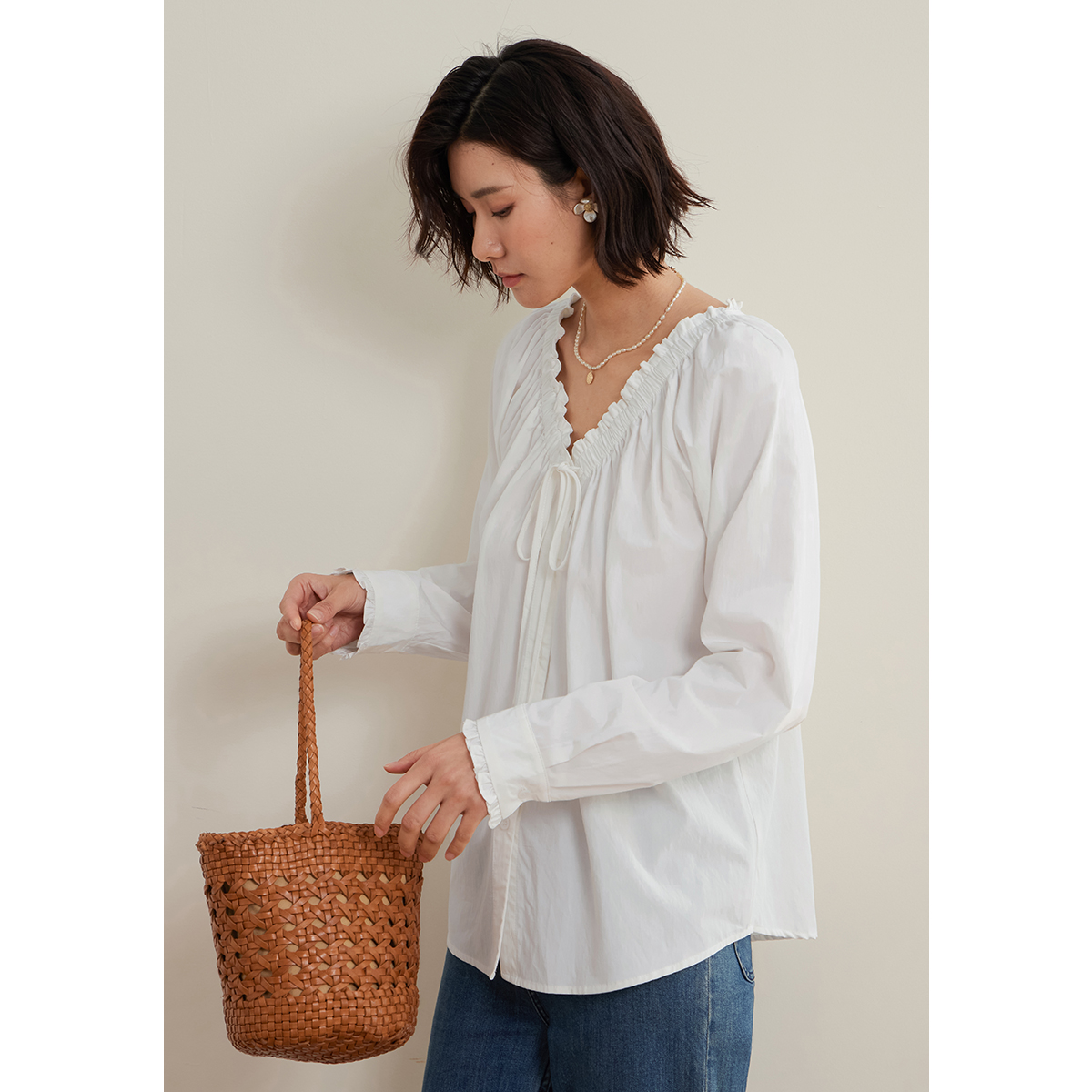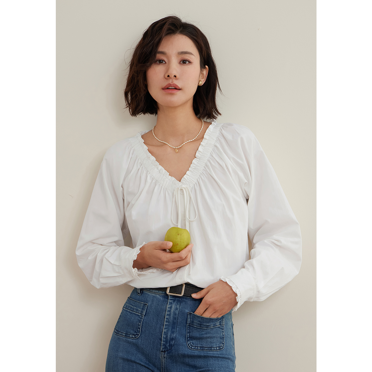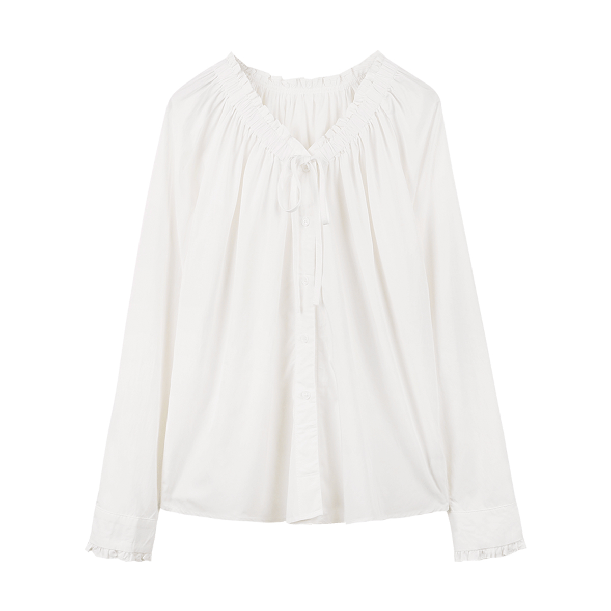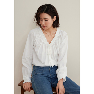 泡泡袖 弥古2025秋季 女上衣高级感正肩法式 白色v领衬衫 白衬衣 长袖