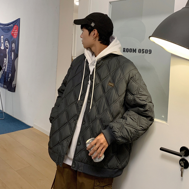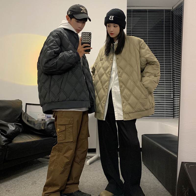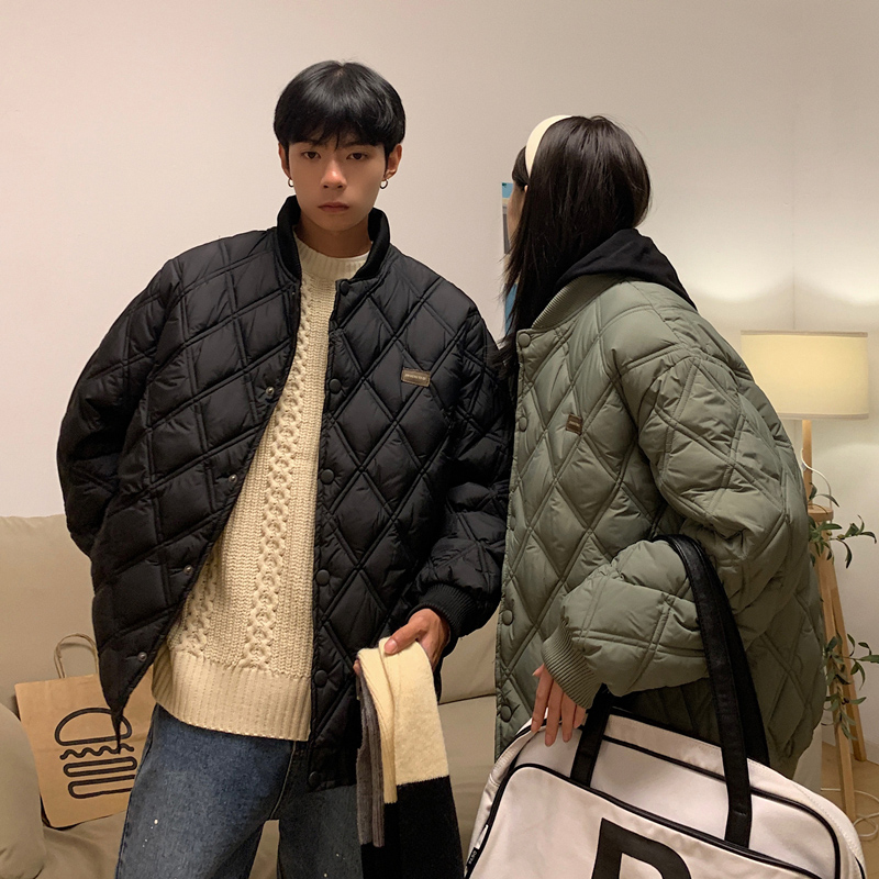 菱形格绣标棉衣男春秋ins港风情侣休闲棉袄百搭纯色宽松开衫 棉服