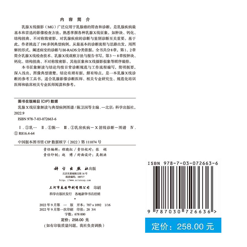 现货 社9787030726636 乳腺X线征象解读与典型病例图谱陈卫国等主编科学出版
