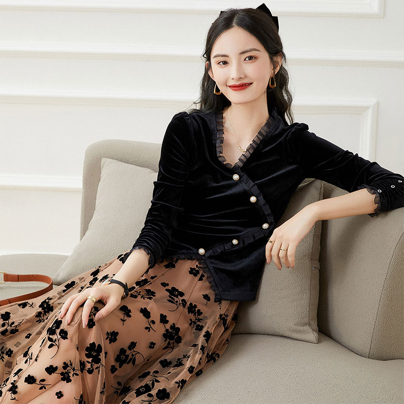 复古优雅V领丝绒女式 白鹿语木耳花边拼接衬衫 时尚 新款 衬衣 春季