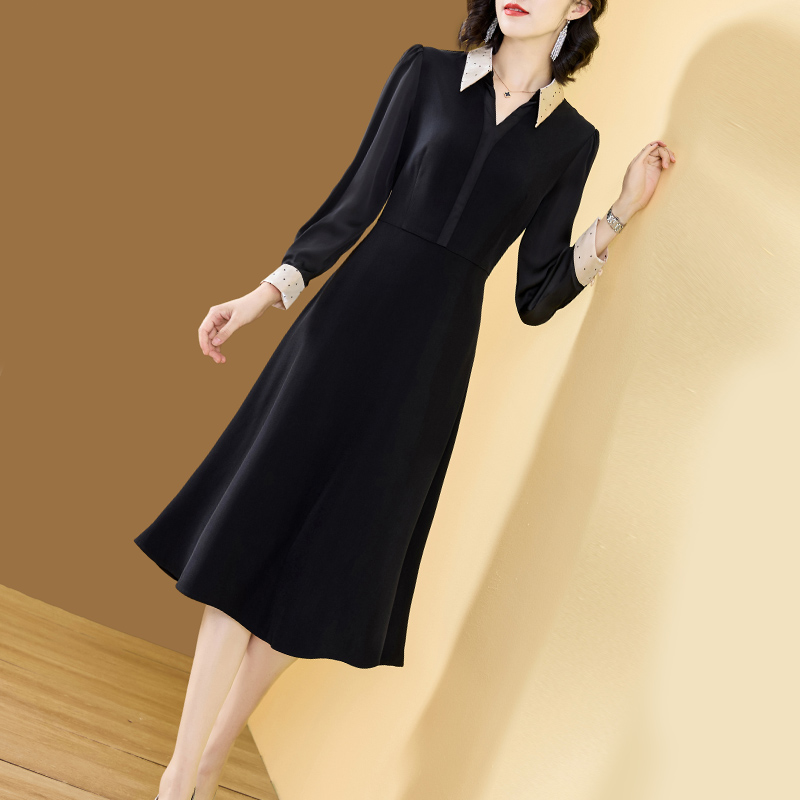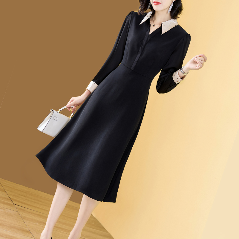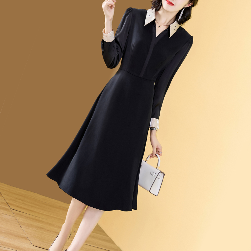 连衣裙女通勤职业2024年新款 中长款 时尚 长袖 裙子 气质春款 方领长袖