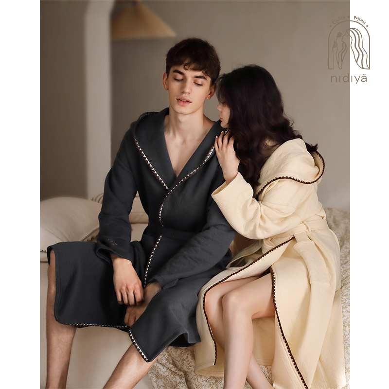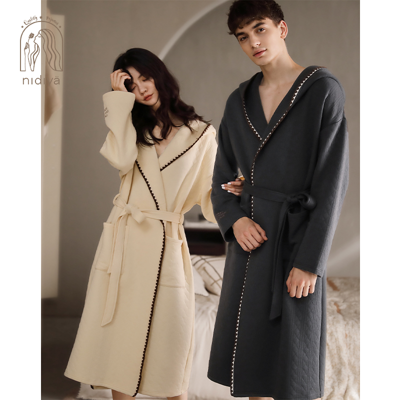 妮狄娅情侣睡衣女秋冬季 浴袍 纯棉加厚夹层保暖男连帽绑带休闲时尚