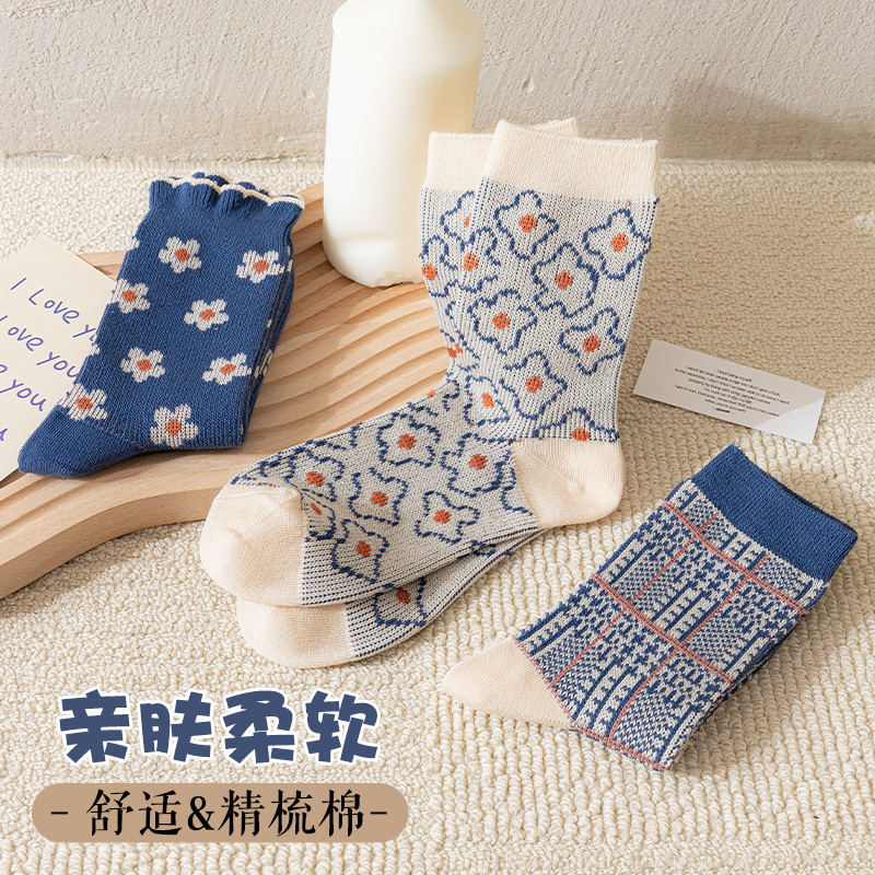 蓝色袜子女秋冬中筒袜ins潮网红款 长筒月子袜 堆堆纯棉长袜春秋季