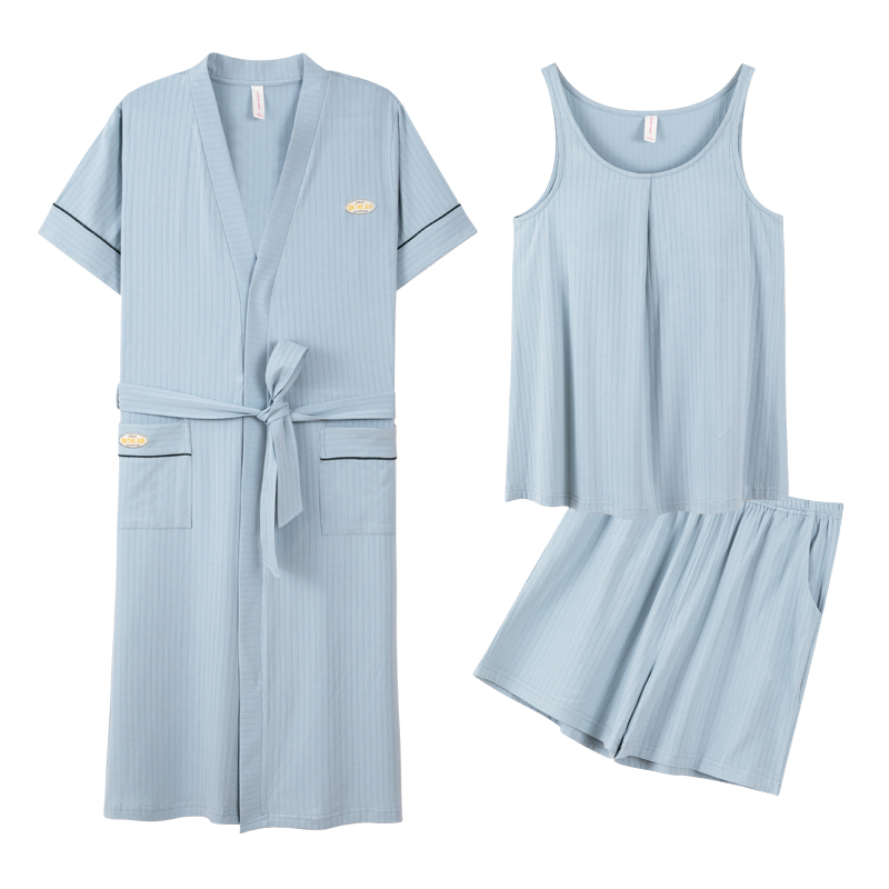 莫代尔男士 薄款 睡袍长款 背心家居服女短袖 三件套 套装 情侣睡衣夏季
