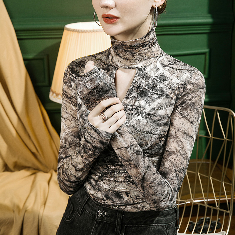 新款 上衣小衫 高领蕾丝打底衫 扎染印花镂空性感长袖 女修身 2025秋季