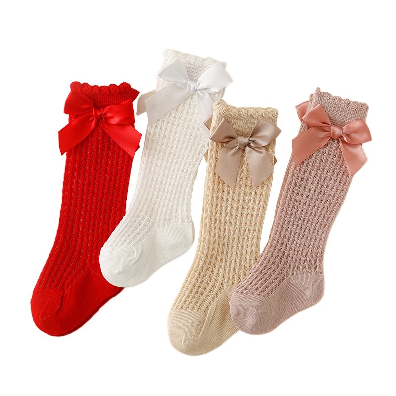 婴儿学步鞋 袜春夏西班牙移圈镂空地板皮底袜女宝宝蝴蝶结中筒袜子